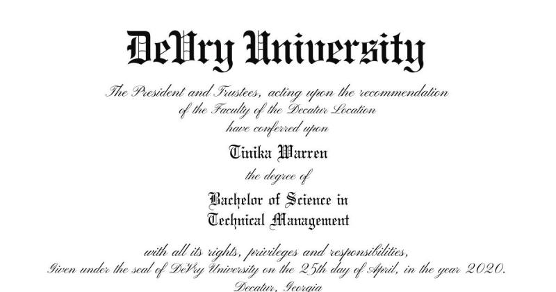 Dr. Tinika S. Warren, Master's in Community Development and Social Work "h.c." Ph.D. 2016, from Los Angeles Development Church & Institute, also holds a, 2020, Earned DeVry Keller University academic accredited four-year degree Bachelor of Science, Technical Management concentration of Project Management to safeguard the beauty industry, childcare, healthcare, restaurant dining.